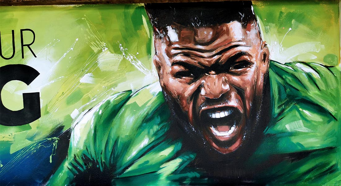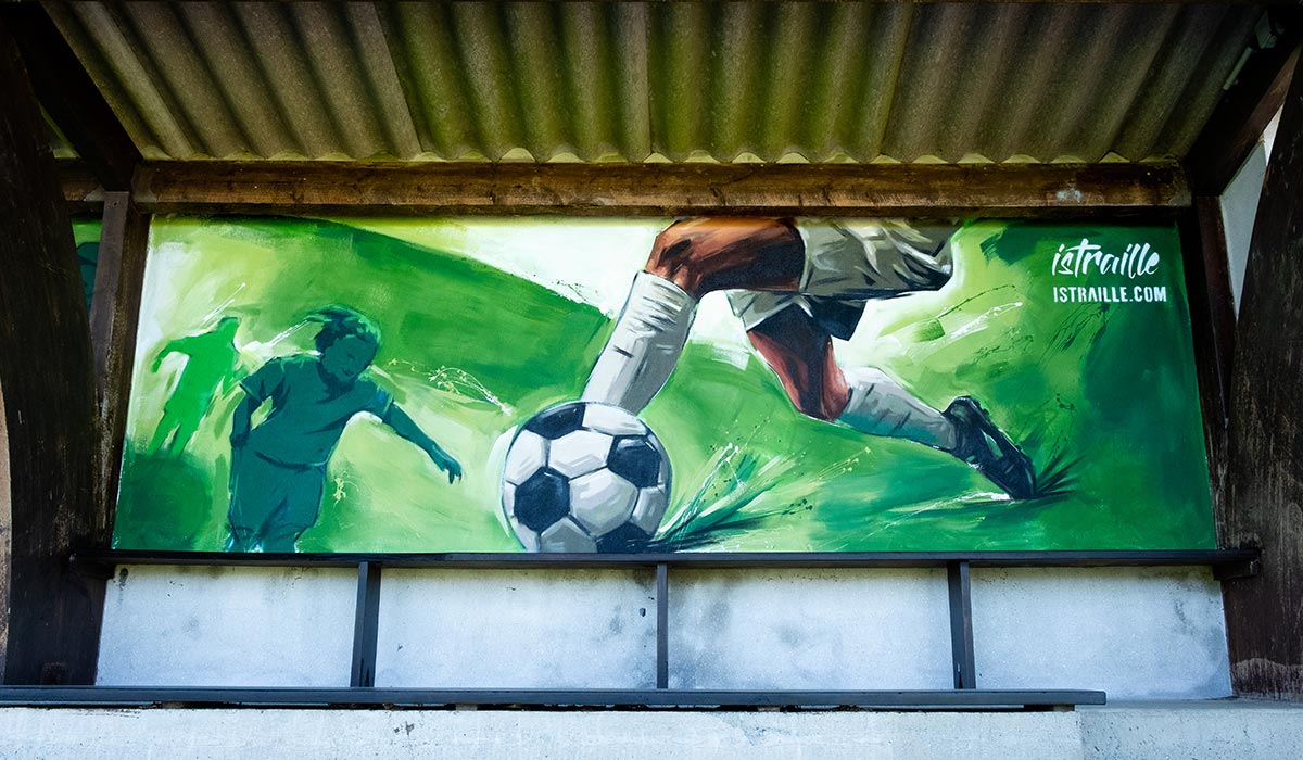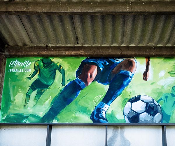 Réalisation d’une décoration extérieur pour le club de foot de Landudec. La peinture est en résonance avec la vibration que procure le sport et donc le foot.
