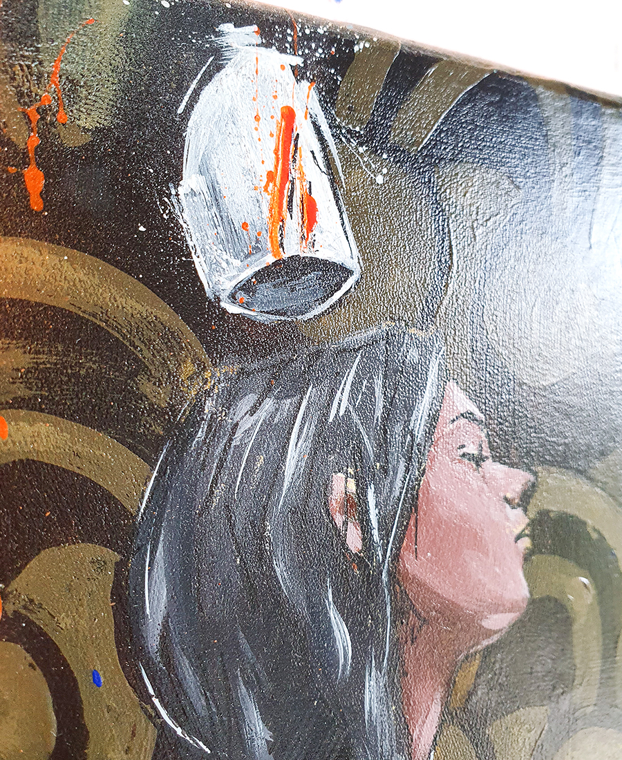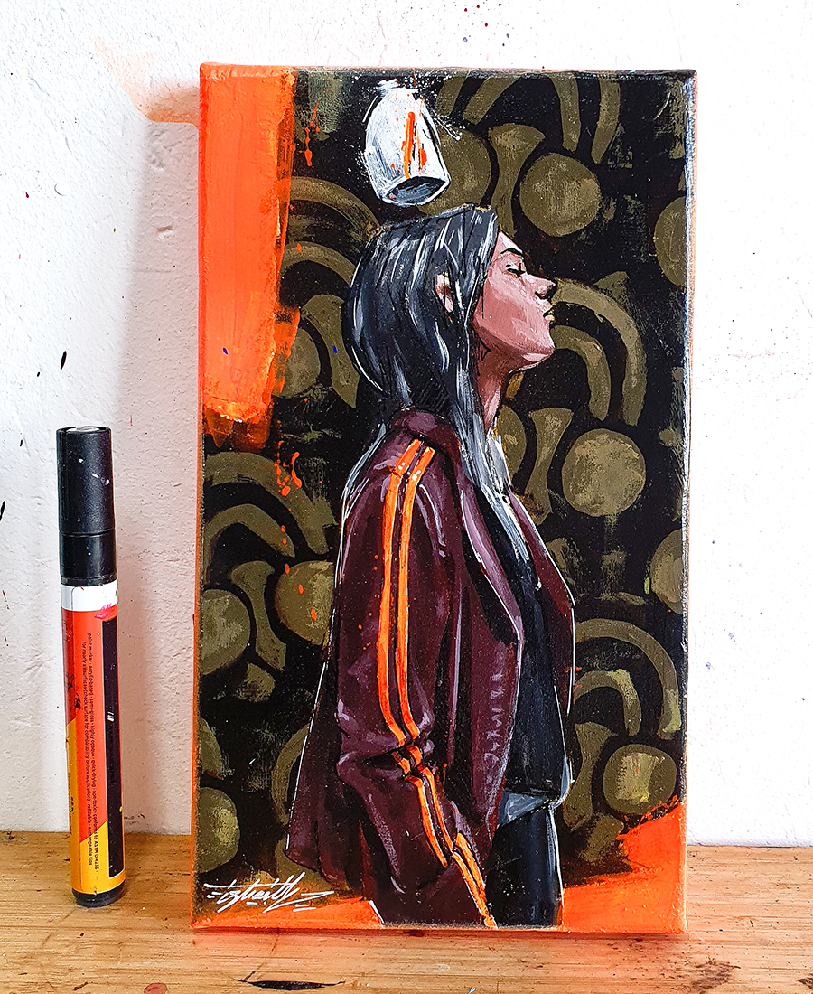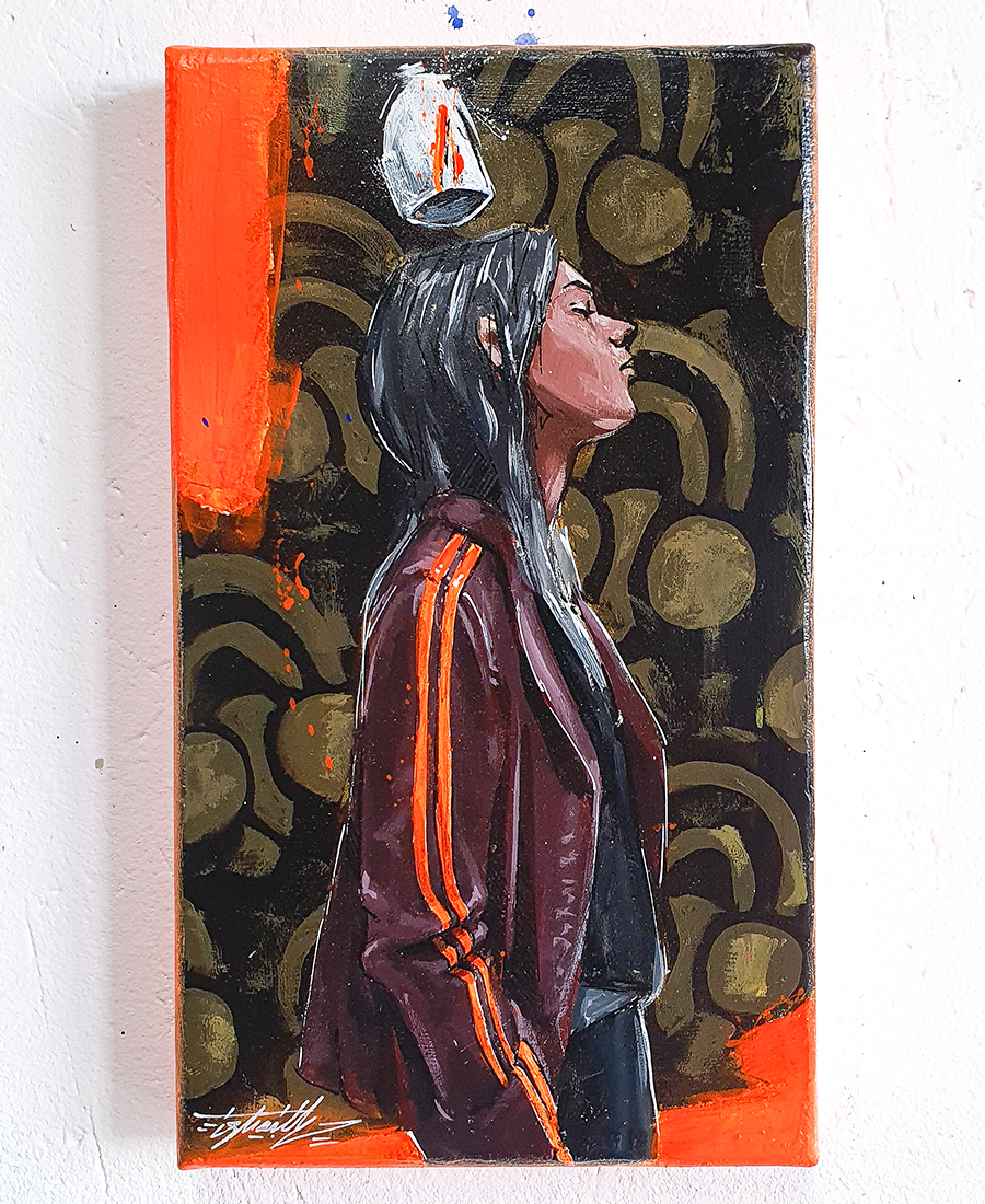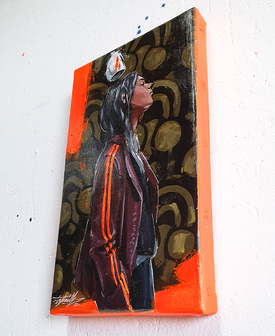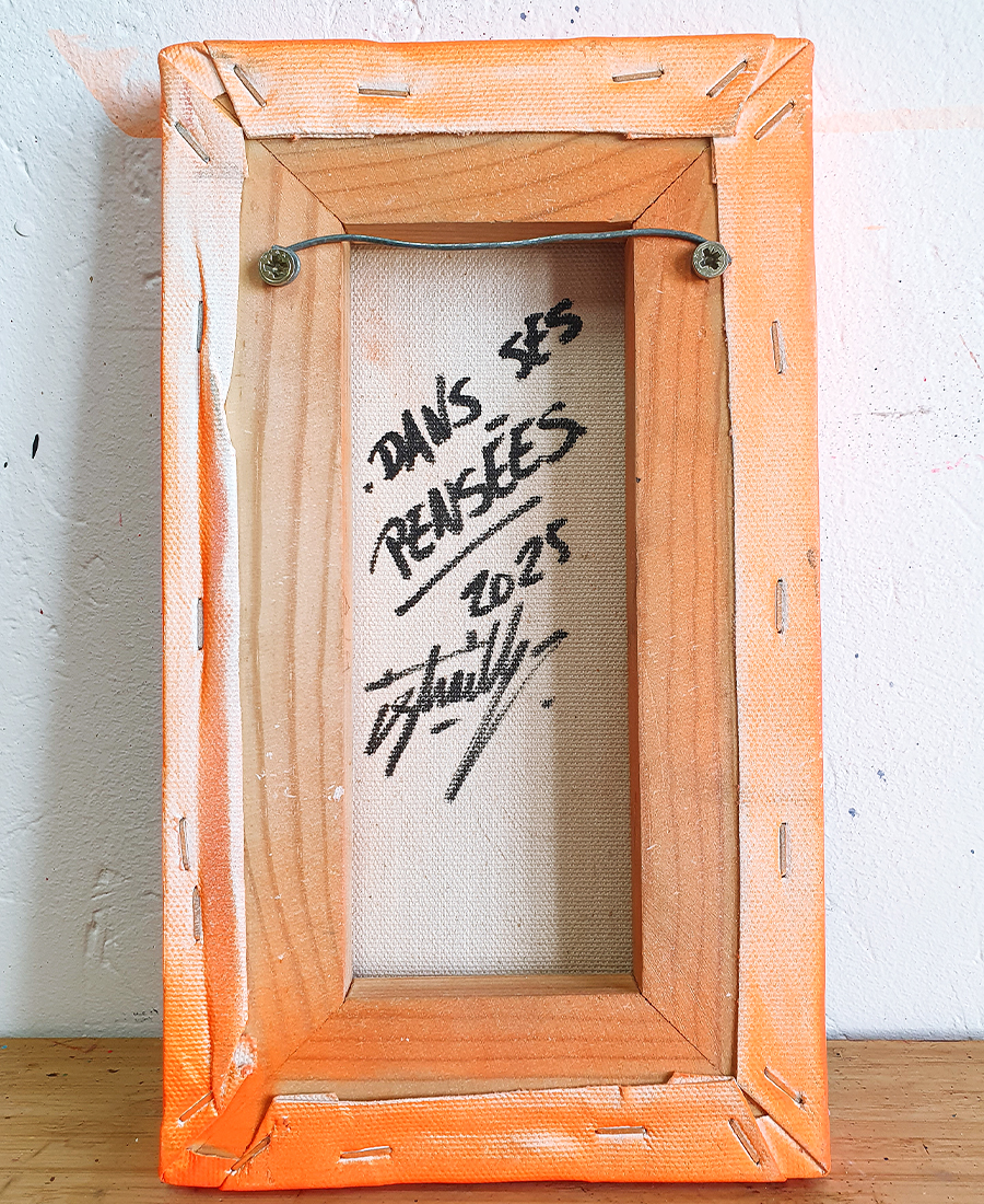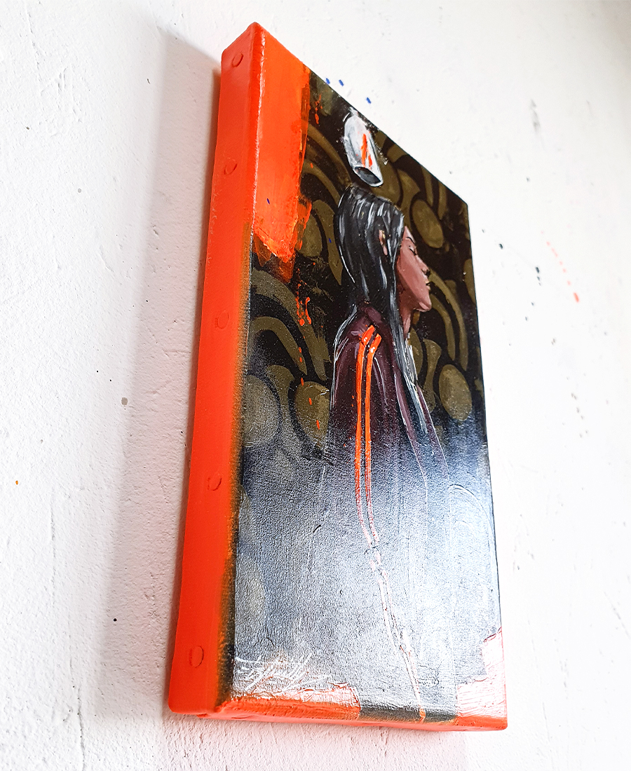 Œuvre sur toile, représentant une femme contemporaine avec la coiffe Bigoudène modernisée et en lévitation. Le fond représente le paon Bigouden. Le paon est un symbole emblématique du Pays Bigouden, notamment à travers sa broderie traditionnelle, où la plume de paon représente l’orgueil et la fierté des habitants. Elle est signée par la main de l’artiste en Recto verso. Elle est vendue sans cadre.