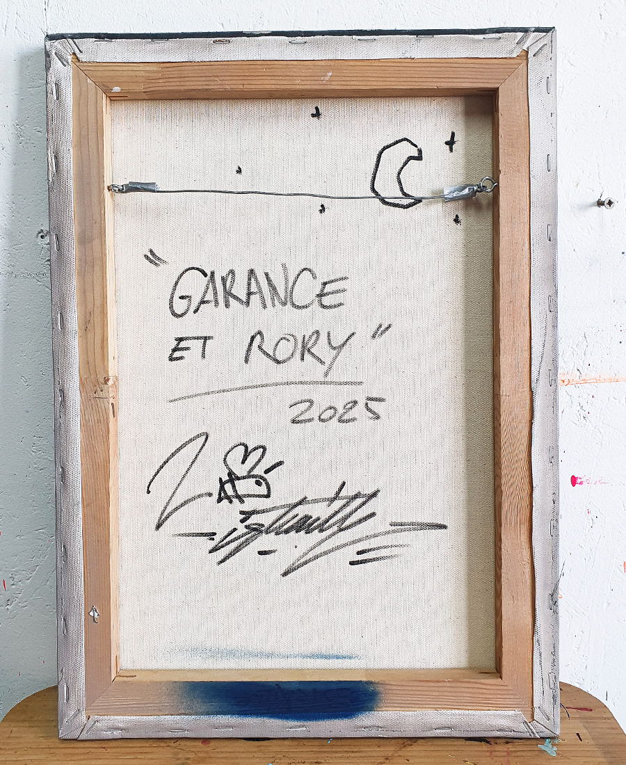 Œuvre sur toile, représentant une femme bretonne à côté d’un loup. L’histoire de cette toile fait écho à l’histoire de Landerneau avec la « Fosse aux Loups » de La ville. L’artiste a voulu mettre la femme et le loup côte à côte, et il a fait un clin d’oeil au « Petit chaperon Rouge » avec sa tenue rouge et la capuche. Elle est signée par la main de l’artiste en Recto verso. Elle est vendue sans cadre.